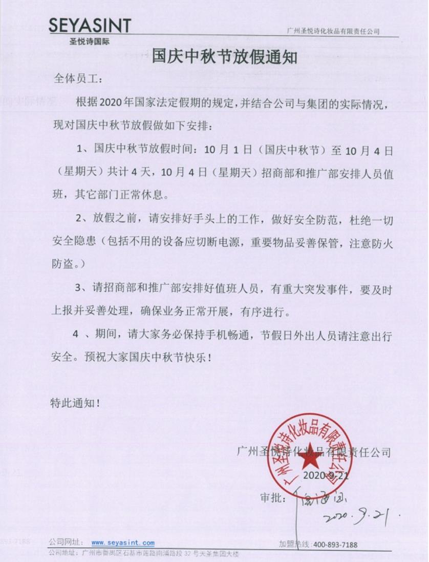 圣悅詩國際美妝中秋國慶放假...